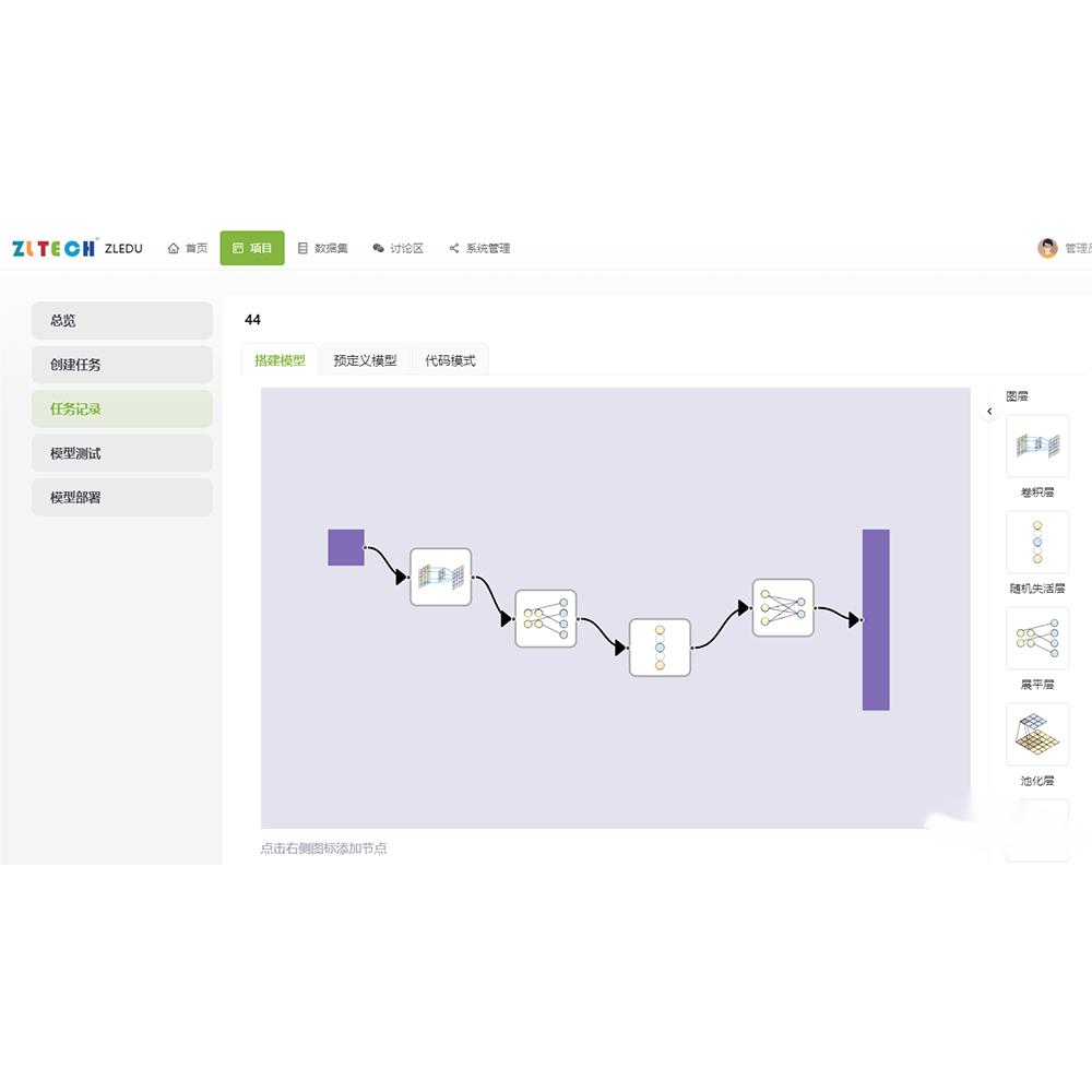 智龍可視化算法平臺(tái)可實(shí)現(xiàn)數(shù)據(jù)采集、數(shù)據(jù)清洗、數(shù)據(jù)標(biāo)注、模型設(shè)計(jì)、模型訓(xùn)練、模型部署等全流程的交互式、可視化操作。采用BS架構(gòu),用戶通過瀏覽器即可進(jìn)行人工智能學(xué)習(xí)。